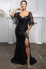 Turn heads in this stunning LA2173B evening gown, designed with elegance and comfort in mind. Crafted from luxurious satin, this floor-length formal dress features a flattering ruched bodice, sheer beaded lace overlay, and flutter sleeves for added sophistication. The thigh-high slit adds a modern touch, balancing allure with refined charm. Perfect for wedding guests, galas, and other formal occasions, this wholesale plus-size evening gown offers timeless style at an unbeatable value for your boutique or store.