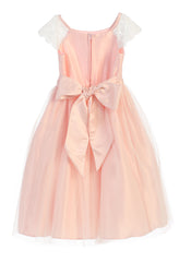 The sweetest flower girl dress that can be worn to any wedding. Features Lace cap sleeves, satin top with tulle skirt. Designed with a simple elegant pearl broach on a bow around the waist.