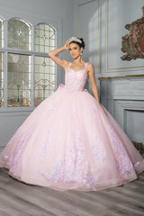 Set the stage for elegance with the LA Merchandise LA269 tulle ball gown adorned with lace, floral appliques, and a touch of glitter. The sleeveless V-neck bodice with boning and pleats flatters, while the lace-up mid-open back, bow detail, and sweep train add elegance. It is ideal for prom, quinceañeras, and Sweet 16.