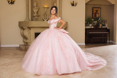Introducing this LA Merchandise LA274 glitter tulle ball gown, designed with a sweetheart neckline, off-the-shoulder sleeves, and intricate floral appliques. Beaded sequins add sparkle, while boning ensures a perfect fit. The lace-up mid-open back, bow detail, and sweep train create an enchanting look. Ideal for prom, galas, and quinceañeras.
