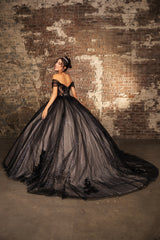 Shine in the mesmerizing LA Merchandise LA244 off-shoulder ball gown. It radiates elegance by featuring a sheer corset bodice adorned with sequin embellishments, 3D floral lace appliqués, and glitter tulle. The lace-up open back and sweeping train complete the look, making it ideal for prom, quinceañeras, galas, and masquerade balls.