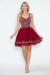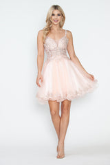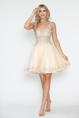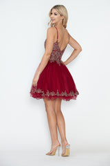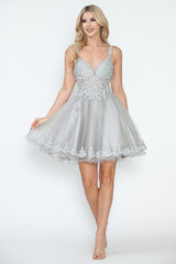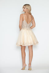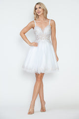 LA Merchandise LAF8234 Glitter Embroidered Short A-Line Party Dress with V-Neck and Illusion Bodice