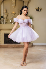 Sparkle in this enchanting LA Merchandise LA2159 short A-line dress. It's the perfect mix of elegance and charm, designed with a glittering tulle overlay, a sweetheart neckline, and off-the-shoulder sleeves. The structured corset bodice with a lace-up open back flatters your figure, making it ideal for prom, homecoming, or any occasion.