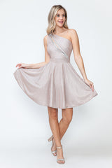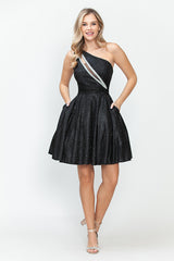 Make a statement in this LA Merchandise LAF5272 dazzling short A-line dress featuring embellished lace, soft cup padding, and a stylish one-shoulder asymmetrical neckline. The layered glitter fabric adds sparkle, while the double strap back with zipper closure ensures a secure fit. Ideal for HOCO, cocktail parties, graduations, and all your standout celebrations.