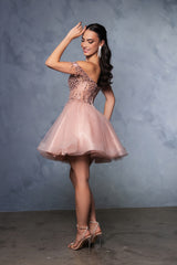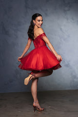 Embrace glamour in the LA Merchandise LA2129 short A-line dress made from glitter tulle. With a beaded, sequin-embellished illusion corset bodice, off-shoulder neckline, and sleeveless design, it radiates sophistication. The open back with lace-up and zipper ensures a perfect fit—ideal for homecoming, parties, or cocktails.