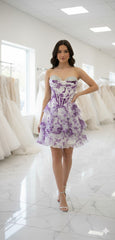 Turn heads in Style LA2215, a flirty short cocktail dress featuring a strapless, rhinestone‑trimmed sweetheart neckline and a structured corset bodice with visible boning for a cinched, hourglass look. The A‑line mini skirt is finished with three soft, tiered ruffles that add volume and movement. A chic toile floral print—available in blue, purple, or pink on white—gives the dress a porcelain-inspired finish that photographs beautifully.