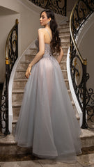 Step into elegance with this exquisite LA2178 A-line evening gown. The sheer illusion bodice is beautifully decorated with intricate beading and sequins, creating a glamorous look that sparkles with every movement. Featuring a plunging neckline with delicate spaghetti straps, this gown strikes a perfect balance between allure and sophistication. The full glitter tulle skirt adds graceful volume, while the lace-up back provides a flattering, adjustable fit. Perfect for prom, pageants, and formal events, this gown is a must-have for boutiques and wholesale buyers seeking timeless, elegant designs.