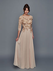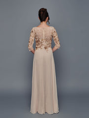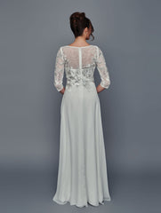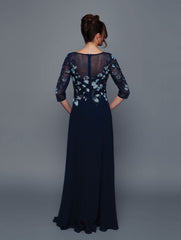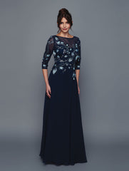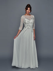 Make an entrance in this elegant LA Merchandise LADK321 floor-length chiffon formal gown, which offers sophistication and comfort for special occasions. Featuring a graceful illusion bateau neckline and a sheer embroidered bodice, the dress showcases delicate floral embroidery that flows organically across the upper bodice and sleeves, creating a refined, flattering look. The 3/4-length illusion sleeves provide stylish coverage, making this gown ideal for the mother of the bride, the mother of the groom, wedding guests, evening galas, and formal events. The softly flowing A-line chiffon skirt drapes effortlessly to the floor, offering a flattering silhouette that moves beautifully with every step. The back features a sheer illusion panel with elegant embroidery and a concealed zipper closure, completing the dress with a polished, sophisticated finish.