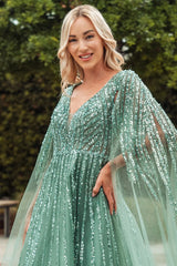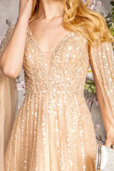 Wholesale Mother of the Bride Long Sequin Gown with Sheer Cape Sleeves, Illusion Bodice & A-Line Skirt by LAS3494