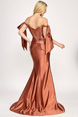 Wholesale Satin Off-Shoulder Corset Gown with Draped Skirt & Side Slit By LAF8401