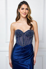 Turn heads at any formal affair with the LAA4049, a captivating strapless evening dress crafted to make a statement. This mermaid gown features a structured sheer corset bodice, embellished with sparkling rhinestones arranged in elegant vertical lines that enhance the figure. The sweetheart neckline adds romantic allure, while the lace-up back ensures a secure and flattering fit. The luxe satin skirt cascades into a sweeping mermaid silhouette with subtle draping across the waist and a daring thigh-high slit for a sultry touch. Ideal for proms, pageants, galas, and other upscale events, this gown seamlessly blends elegance with modern glamour.