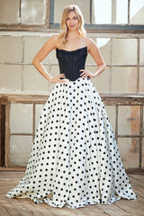 Elevate your formal-wear collection with this LA Merchandise LAA8071 elegant two-piece formal set, featuring a separate strapless corset bodice and matching polka dot skirt. Designed for versatility and statement appeal, this set allows for mix-and-match styling while delivering a cohesive, high-fashion look. The strapless corset bodice is structured with visible boning to create a flattering, sculpted silhouette. Delicate beaded trim along the neckline and waist adds a refined, upscale finish. The bodice features a lace-up back closure, offering adjust ability and a secure, customized fit. Paired with the bodice is a full-length A-line satin skirt featuring a classic polka-dot pattern. The smooth, flowing fabric provides graceful movement and volume, making it perfect for formal and special occasions. Worn together, the pieces create the look of a dramatic A-Line gown while maintaining the flexibility of separates. Ideal for prom, formal events, evening wear, galas, pageants, themed occasions, and special events.