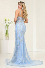 Steal the spotlight in the LA Merchandise LA8144 prom dress, a stunning blend of modern allure and timeless elegance. This sleek gown features a shimmering sequin pattern, a deep V-neckline with an illusion inset, and sheer side panels for a graceful, barely-there effect. Spaghetti straps lead to a bold lace-up open back, while the figure-hugging sheath silhouette is enhanced by a daring high slit and sweeping train. Perfect for making a lasting impression at prom, galas, or any special occasion. Model is wearing the Baby Blue color.