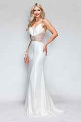 Dazzle in this LA Merchandise LAF8344 elegant satin mermaid gown for bridal celebrations and destination weddings. Featuring a Sweetheart neckline with delicate spaghetti straps, it showcases a sheer fitted bodice with soft cup padded inserts for a flattering shape. The ruched open back with zipper closure adds modern allure, while a graceful sweep train completes the romantic look. Ideal for engagement parties and bridal events.