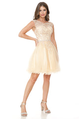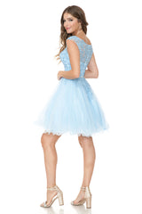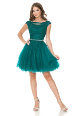 LA Merchandise LAF8177 Lace Applique Cap Sleeve Short Tulle Party Dress with Rhinestone Belt