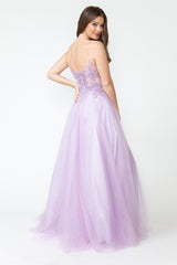 Make a entrance in this ethereal LA Merchandise LAF8182 designed to dazzle at any formal event. The dress features a sheer illusion bodice adorned with intricate floral appliqués, adding a romantic and feminine touch. Spaghetti straps lend a delicate appeal, while the voluminous tulle skirt flows gracefully, offering princess-like elegance. Whether it's for a prom, pageant, or formal evening affair, this gown is a flawless choice for making unforgettable memories.