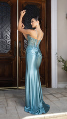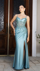 Satin Corset Evening Prom Dress with Slit and Lace-Up Back By LA2183