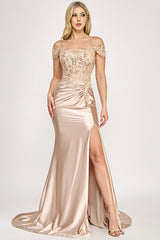 Wholesale Off-Shoulder Satin Evening Gown with Beaded Bodice and High Slit By LAF8348
