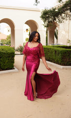 Turn heads in this stunning LA2173B evening gown, designed with elegance and comfort in mind. Crafted from luxurious satin, this floor-length formal dress features a flattering ruched bodice, sheer beaded lace overlay, and flutter sleeves for added sophistication. The thigh-high slit adds a modern touch, balancing allure with refined charm. Perfect for wedding guests, galas, and other formal occasions, this wholesale plus-size evening gown offers timeless style at an unbeatable value for your boutique or store.