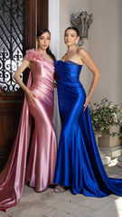 Elevate your formalwear collection with this exquisite LA2175 satin evening gown. Featuring an elegant off-shoulder neckline, intricate floral appliqué accents, figure enhancing ruching, and a dramatic draped train, this gown is designed to captivate. Crafted from premium satin with a lustrous finish, it exudes timeless sophistication. Perfect for wedding guests, galas, pageants, proms, and red-carpet events, this wholesale formal dress brings luxury and elegance to every special occasion.
