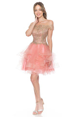 This stunning short off-shoulder party dress, style LA Merchandise LAF8151, is designed to capture the spotlight on any special occasion. Featuring a fitted gold metallic embroidered bodice and a multi-layered tulle skirt, this dress offers a perfect balance of glamour and grace. Crafted for standout occasions such as proms, homecomings and cocktail parties, this A-line silhouette delivers both comfort and elegance. The off-the-shoulder neckline enhances the feminine appeal, while the structured corset-style bodice ensures a secure and flattering fit. Ideal for retailers seeking to stock affordable luxury dresses, this style is a customer favourite for semi-formal and formal occasions.