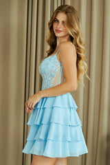 Elevate your inventory with the LAA2062S, a charming short dress designed to enchant at any semi-formal event. This flirty yet sophisticated style features a sheer corset bodice adorned with floral lace embroidery and shimmering sequin accents. The sweetheart neckline and delicate spaghetti straps frame the décolletage beautifully, while structured boning provides both support and elegance. The layered ruffle skirt flows with playful movement, creating a fun and flattering silhouette ideal for twirling at any celebration. With a fitted waist, low open back, and flattering A-line structure, this dress blends youthful energy with timeless appeal. A must-have piece for boutiques catering to homecoming, bat mitzvah, or semi-formal occasions.