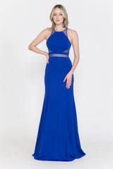 This special occasion long gown features: Sleeveless, sheer waist and cutouts, has zipper closure.
