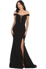 This sexy off shoulder stretchy dress features: off the shoulder, deep v-neckline with mesh modesty piece, thigh high slit, zipper closure, & short train.
