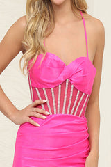 Details: Twisted Bustier Bodice, Spaghetti Strap, High Slit, Sweep Train, Jeweled Sheer Corset, Criss-Cross lace -up Back.