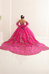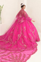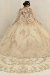 Details: Bustier Bodice, Corset Back, Beaded, Embroidered, Rhinestone, Detachable Cape and Sleeves, Bow Accent, Glitter Skirt, Lace up Back, Cathedral detachable velcro Train. (Please note: Slight natural fall out of glitter may occur 1st couple of try-ons).