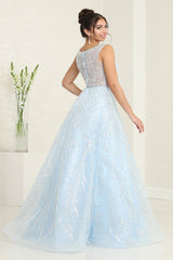 LA Merchandise LA8081 Gown—a show-stopping addition to your store's clothing lineup. This long gown features an enchanting illusion top adorned with sequins, creating a mesmerizing sparkle that catches every eye. The A-line silhouette flatters the figure, while the sweep train adds royalty. Ideal for Red carpet events, Proms, and Galas, this gown glitter accent is designed to make your clients feel like stars.