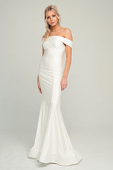 This off the shoulder bodycon wedding dress. A Bridal gown that is Stretchy with a short train.