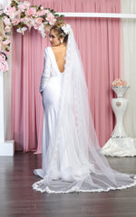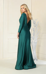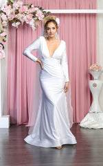 Long Sleeve Simple yet Fancy Evening Dress. Can be work for a mother of bride or bridesmaids. Stretchy, V-Neckline, ruched waistline, mermaid style with a small train.