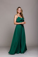 A beautiful long spaghetti straps chiffon bridesmaids dress features an open back, flowy look.