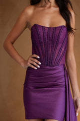 Details: Soft Cup Padded, Corset Bodice, Side Sash, Beaded, Ruched, Lace up Back with Zipper Underneath, Open Back, Short Hem.