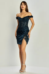 FAQ about LA Merchandise LAL1084 Off-Shoulder Floral Corset Satin Mini Dress