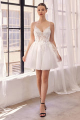 Details: Soft Padded Cup Inserts, Fitted Bodice, Embellished Lace, Spaghetti Straps, Open Back, Layered Pattern, Glitter, Back Zipper, Short Hem. (Please note: Slight natural fall out of glitter may occur 1st couple of try ons)