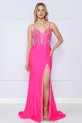 This bodycon prom dress features: Rhinestones on bodice, spaghetti straps and upper back, has high slit, V- neckline and short train.