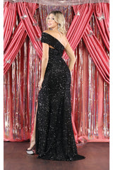 This red carpet gown features: One shoulder, sequins, high slit, short train, and zipper closure. Fabric: Sequin.