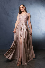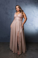 Embrace this exquisite LA Merchandise LA2137 glittering A-line gown. This fitted bodice dress is a showstopper, featuring a plunging V-neck, spaghetti straps, and floral embroidery with sequin accents. Pleated detailing and a high slit add drama, making it the perfect choice for galas, red carpets, and special occasions.
