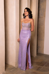 Details: Illusion Corset Bodice, Beaded and Sequin Embellishments, Glitter, Fitted Bodice, High Slit, Mid Open Back, Concealed Back Zipper, Sweep Train. (Please note: A slight natural fall out of glitter may occur during the first couple of try-ons).