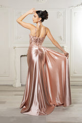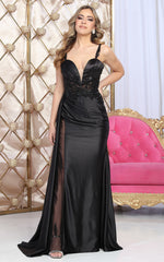 Unwrapping the newest arrival with the LA Merchandise LA8103 satin mermaid gown. Embellished straps, an illusion inset, and ornate applique add elegance, while a side sash cascade, illusion high slit, and sweep train create drama. A midrise back with a concealed zipper completes the look. It is ideal for proms, galas, and black-tie events.