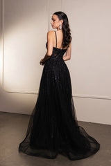Reform your store offerings with this glitter tulle LA Merchandise LA8143. Spaghetti straps frame a V-neckline with an illusion inset, while sheer sides and sequin floral details add charm. A fitted bodice, open back, and horsehair hemline enhance the silhouette, ending in a sweep train for a dramatic finish. Ideal for proms and galas.