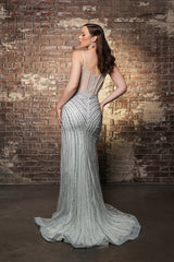 Introduce the new trend with this LA Merchandise LA8156 sheath gown. It exudes elegance and features a sheer corset bodice, delicate straps, sequins, and beaded embellishments. The high slit and horsehair hem adds drama, while the zipper back ensures a perfect fit. Finished with a sweep train, it's ideal for pageants, prom, and red-carpet events.