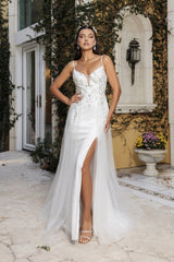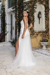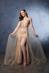 Details: Beaded Applique, Sheer Insert, Floral Embroidery, Fitted Bodice, High Split, Mesh Skirt Overlay, Open Back, Soft Padded Cups Inserts, Lining, Zipper Back, Sweep Train, Horsehair Hem.