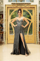 Enliven your boutique's creation with the LA Merchandise LA8169 sheath gown with a sweetheart neckline and delicate thin straps. The fitted bodice is adorned with dazzling beaded embellishments, while a high slit and horsehair hemline add drama. A mid-open back and sweep train completes the look and is ideal for galas, proms, and red-carpet events.