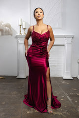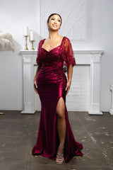Turn heads in this stunning LA2173B evening gown, designed with elegance and comfort in mind. Crafted from luxurious satin, this floor-length formal dress features a flattering ruched bodice, sheer beaded lace overlay, and flutter sleeves for added sophistication. The thigh-high slit adds a modern touch, balancing allure with refined charm. Perfect for wedding guests, galas, and other formal occasions, this wholesale plus-size evening gown offers timeless style at an unbeatable value for your boutique or store.